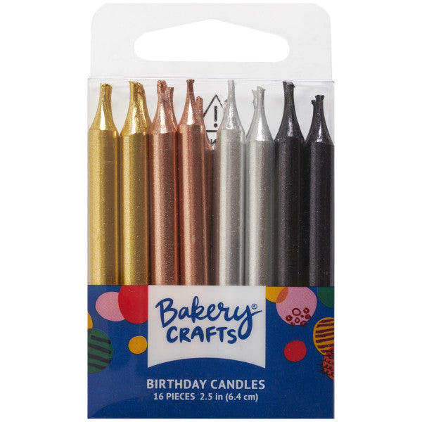 Velas de acabado metálico elegante y uniforme, ideales para aportar un toque sofisticado y profesional a pasteles, cupcakes y postres para celebraciones especiales.