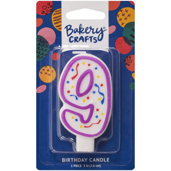 Vela en forma de número “9” con diseño de confeti en la parte frontal y borde púrpura, ofreciendo un acabado brillante y festivo para pasteles y cupcakes de cumpleaños.