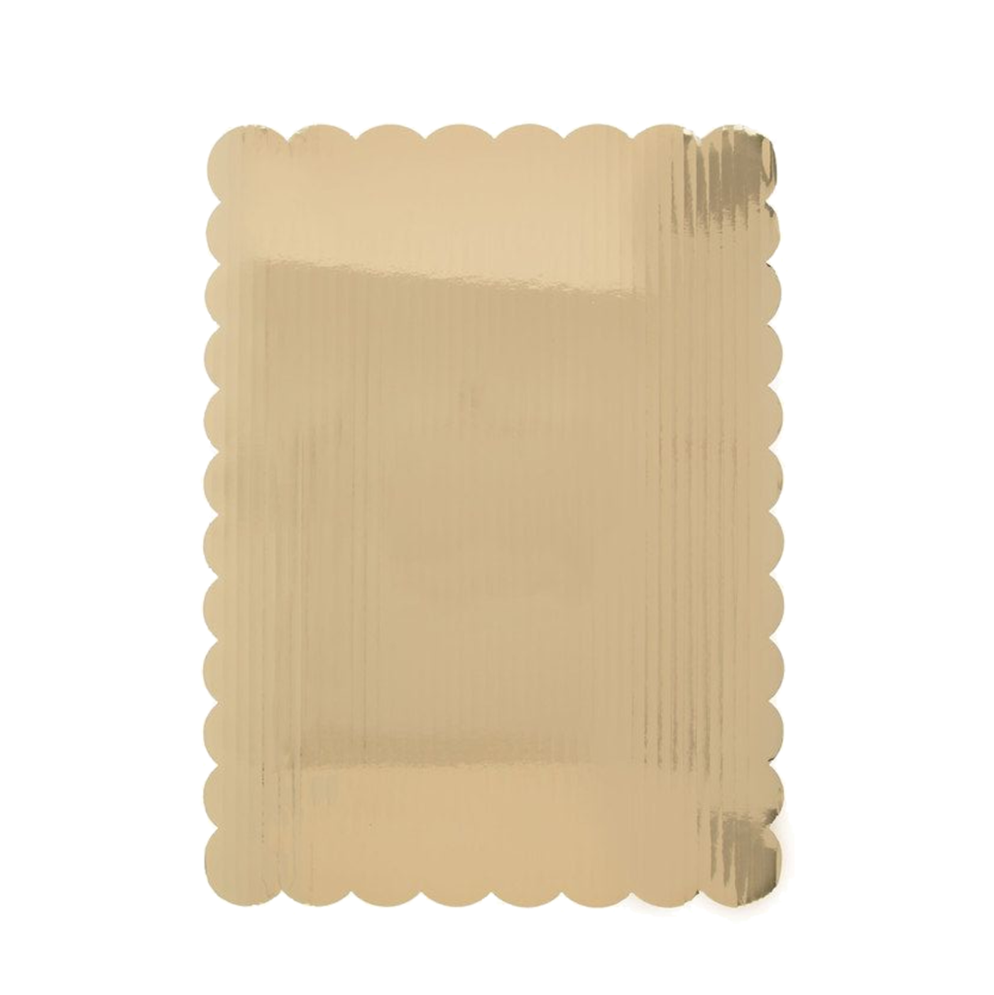 ▪ Base rígida rectangular de cartón grado alimentario con acabado laminado color oro, diseñada para brindar soporte y presentación profesional a productos de repostería.